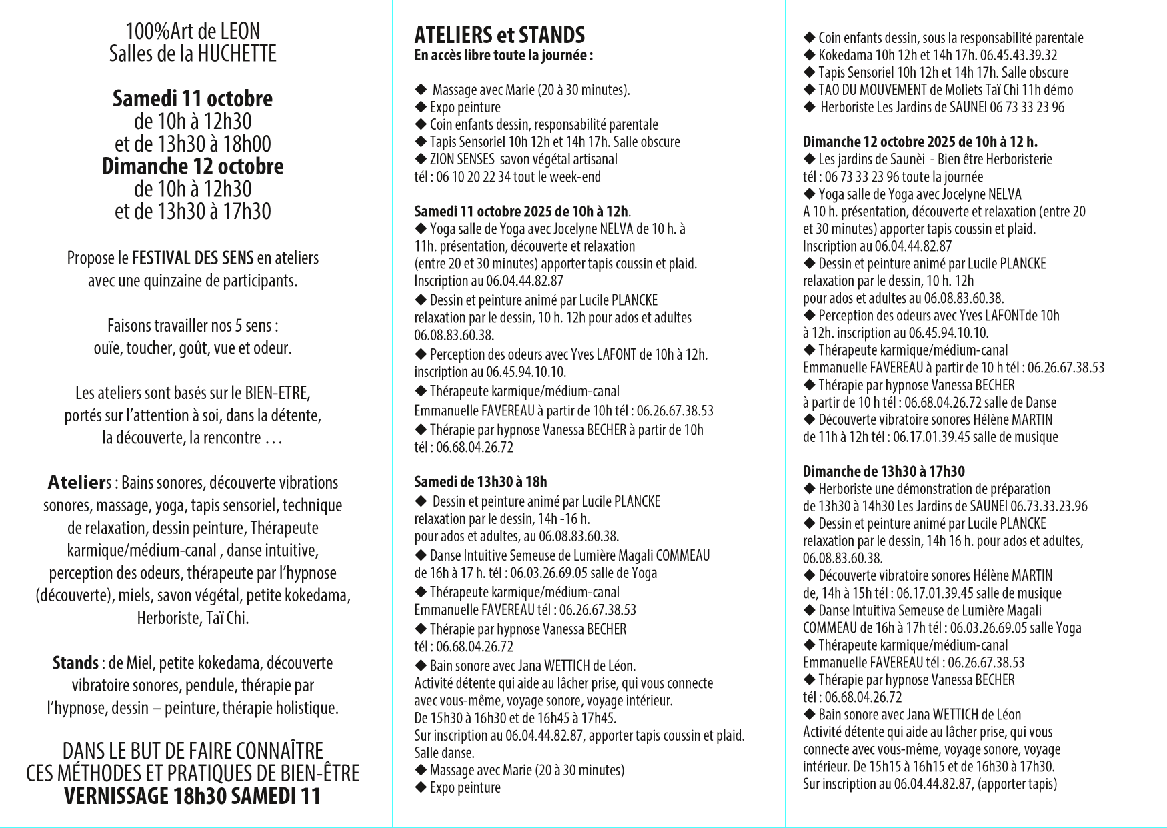 Faisons travailler nos 5 sens : ouïe, toucher, goût, vue et odeur. Les ateliers sont basés sur le BIEN-ÊTRE, portés sur l’attention à soi, dans la détente, la découverte, la rencontre … 16 intervenants seront présents et répondrons à vos questions, expliquerons leurs connaissances dans divers domaines et mettrons leur savoir faire à votre disposition, Pour les enfants, jeux de découvertes sensorielles, plus une table de coloriage à leur disposition.. Ateliers : Bains sonores, découverte vibrations sonores, massage, yoga, tapis sensoriel, technique de relaxation, dessin peinture, Thérapeute karmique/médium-canal , danse intuitive, perception des odeurs, thérapeute par l’hypnose, miels, savon végétal, petite kokedama, Herboriste, Taï Chi. Stands : de Miel, kokedama, découverte vibratoire sonores, pendule, thérapie par l’hypnose, dessin – peinture, thérapie holistique... Entrée gratuite.
