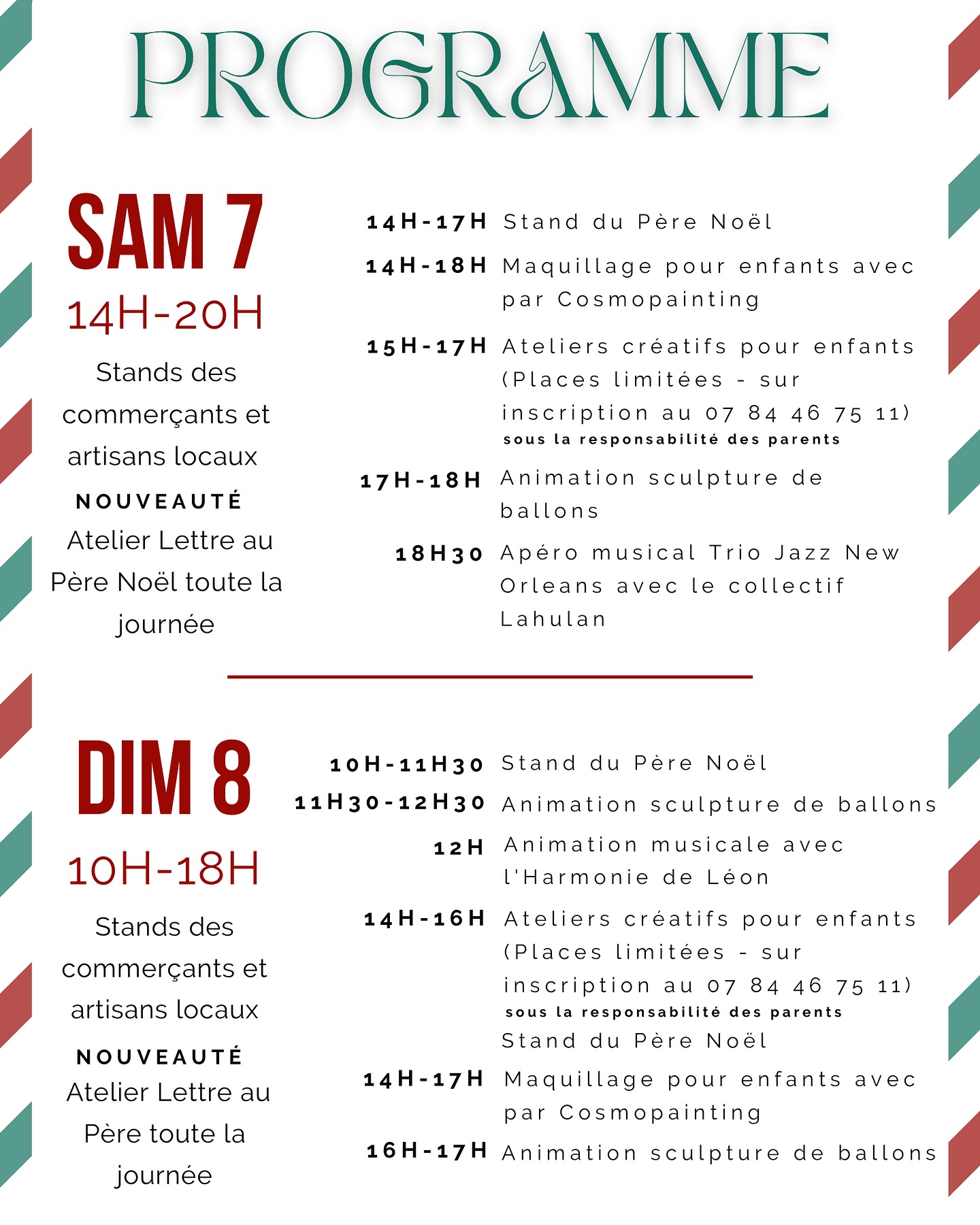 Stands des commerçants et artisans locaux, atelier lettre au Père Noël. Maquillage pour les enfants, animation musicale...